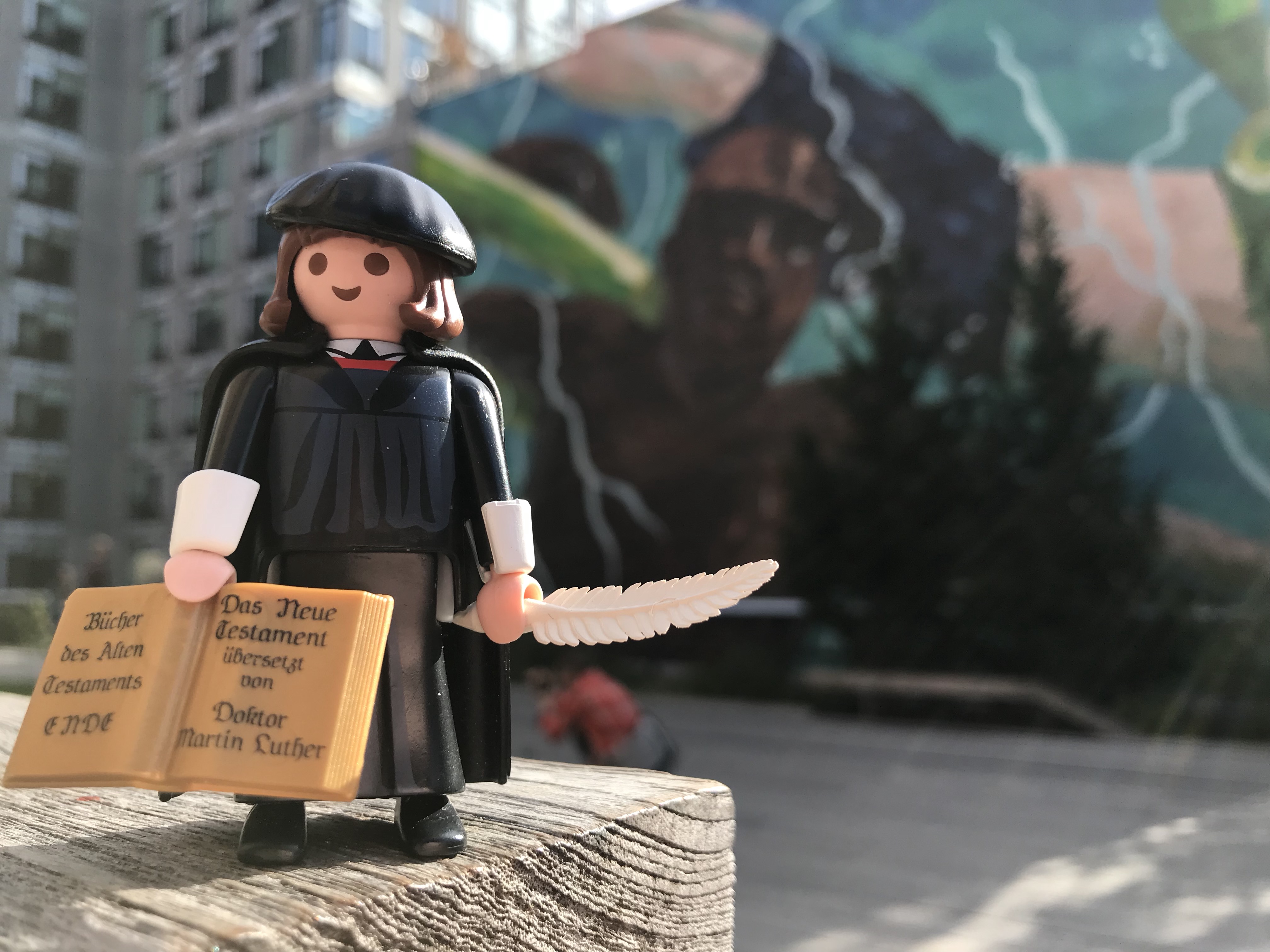 A small scholar in black and white stood in front of a huge graffiti while Henry Taylor´s art work „The floaters“ talked in bright colors about a relaxing day at a pool. The little Playmobil toy set a more earnest tone. Holding a scribes quill in one hand, „Little Luther“ held the Holy Bible in a tight grip as it was glistening in the morning sun. The black letters spoke in a self-confident and brief way of a serious matter that is woven through Martin Luther´s Theology: „The End of the Books of the Old Testament … The New Testament translated by Doctor Martin Luther„. (1)