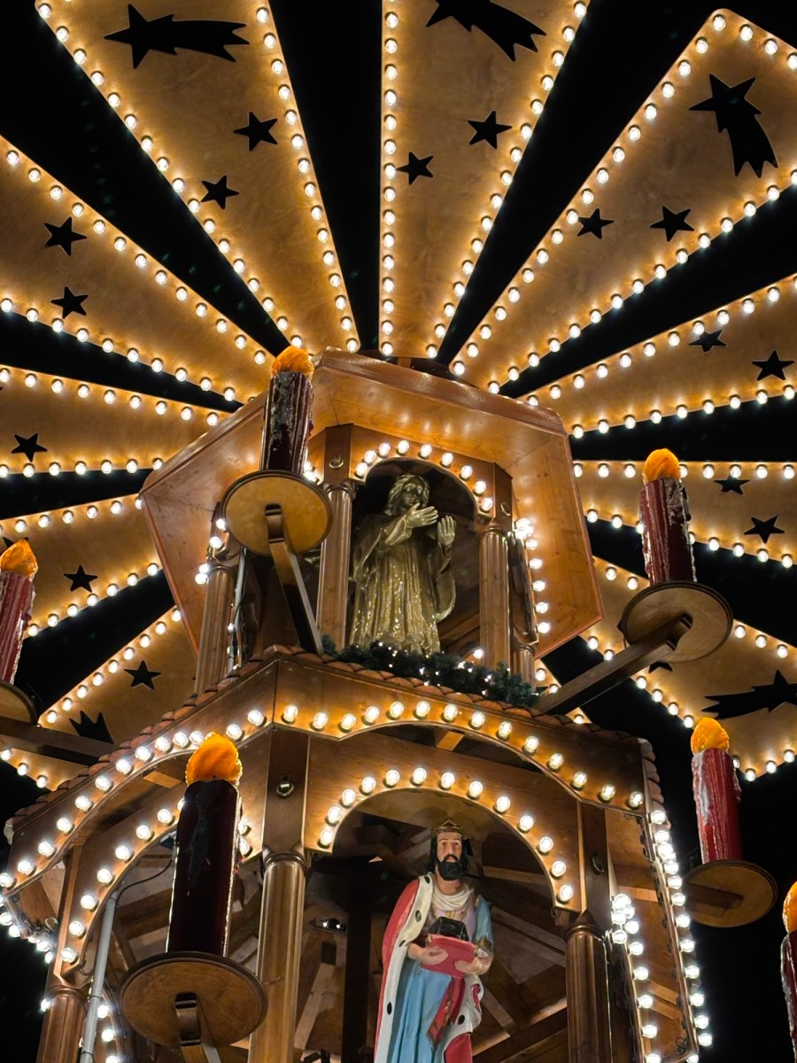 Mein Blick löste sich langsam vom Gedränge unterhalb der Pyramide und fand Halt an ihrer untersten Ebene. Dort, wo die Krippenszene aufgebaut war, wirkte alles überraschend ruhig. Maria saß still, nicht idealisiert, sondern gegenwärtig. Josef stand etwas seitlich, nicht im Zentrum, eher wachend als präsentierend. Das Kind lag zwischen ihnen, nicht herausgehoben, sondern eingebettet. Ochs und Esel rahmten die Szene, als hielten sie den Raum. Die Figuren drehten sich gemächlich, als hätten sie alle Zeit der Welt, und ich hatte den Eindruck, dass genau darin ihre Wirkung lag.