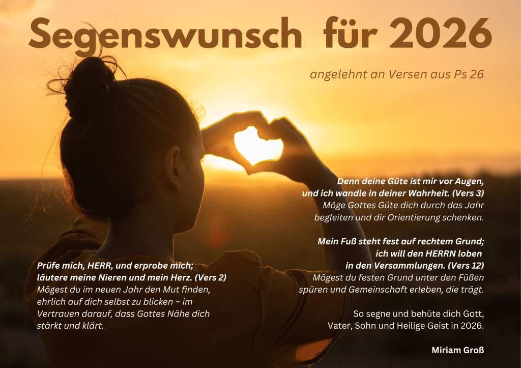 Zum Jahreswechsel möchte ich meinen Leserinnen und Lesern ein kleines Geschenk machen: Segensworte für das neue Jahr. Sie sind verbunden mit drei ausgewählten Versen aus Psalm 26, die den Segenswünschen ihren Rahmen geben – in der leisen Hoffnung, dass diese Gedanken Sie und euch durch das kommende Jahr begleiten mögen.