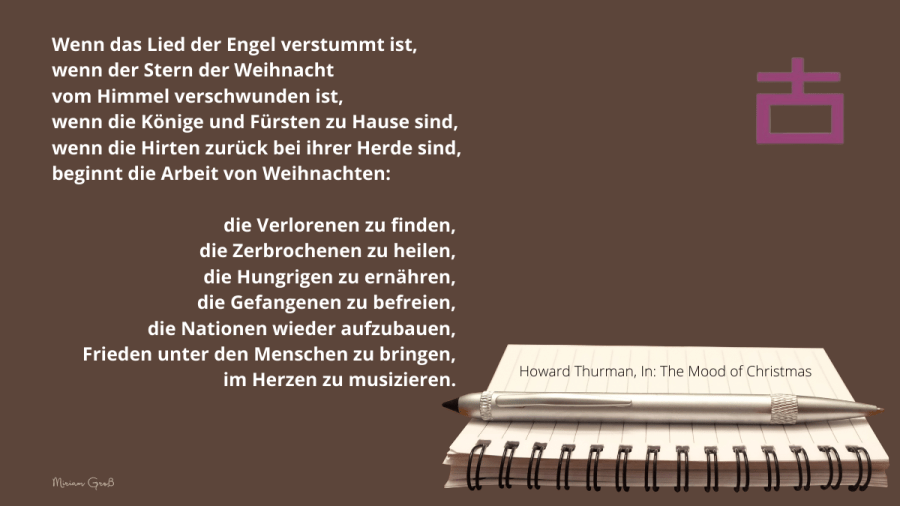 Der US-amerikanische afro-amerikanische Theologe Howard Thurman fasste die Arbeit, die uns mit dem Christfest als Gläubige aufgetragen worden war, in seinem Gedicht „The Work of Christmas“ in sehr treffliche Worte: